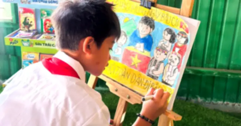 Không khí vẽ tranh diễn ra vô cùng sôi nổi. Mỗi em một ý tưởng, một góc nhìn khác nhau, song tất cả đều thể hiện niềm tự hào và sự quan tâm của thế hệ nhỏ tuổi đối với ngày hội lớn của đất nước. Những câu chuyện gần gũi, giản dị từ các lãnh đạo xã đã khơi gợi nhiều cảm hứng sáng tạo cho các em.