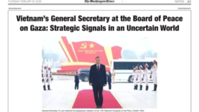 Bài viết đăng trên tờ Thời báo Washington số ra ngày 19/2 cho biết, việc Việt Nam nhận lời mời từ rất sớm, cùng với việc Tổng Bí thư Tô Lâm trực tiếp tham dự phiên họp ngay sau Đại hội đại biểu toàn quốc lần thứ XIV của Đảng Cộng sản Việt Nam, sự kiện chính trị trọng đại nhất của đất nước, đã thể hiện rõ chủ trương chủ động hội nhập quốc tế. Điều này tiếp tục khẳng định đường lối đối ngoại độc lập, tự chủ, vì hòa bình và phát triển bền vững. Quyết định này đồng thời đã cụ thể hóa định hướng chiến lược là đưa đất nước bước vào kỷ nguyên phát triển mới, lấy khoa học, công nghệ và đổi mới sáng tạo làm động lực chủ yếu cho tăng trưởng.