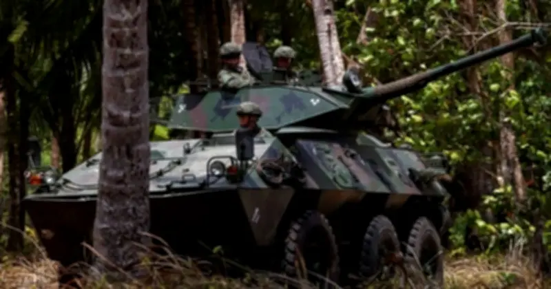 Binh sĩ Philippines trên một xe bọc thép hạng nhẹ tham gia tập trận Balikatan tại Palawan ngày 27.4.2026. Ảnh: Reuters.