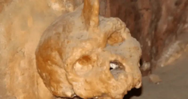 Trải qua hàng thiên niên kỷ, dòng nước giàu khoáng chất nhỏ giọt liên tục lên hộp sọ, bao phủ nó trong một lớp calcite màu nâu sẫm. Cuối cùng, phần xương về cơ bản đã hợp nhất với đá xung quanh, tạo nên hình ảnh ám ảnh như một linh hồn bị mắc kẹt đang nhô ra khỏi vách hang. Phần hàm dưới của nó không bao giờ được tìm thấy, nhiều khả năng là do đã bị quá trình canxi hóa vùi lấp hoàn toàn.