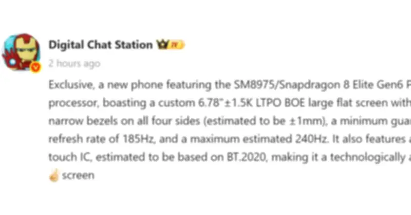OnePlus 16 dự kiến ra mắt tại Trung Quốc vào tháng 10 năm nay, gây chú ý với màn hình tần số quét cao kỷ lục, chip thế hệ kế tiếp của Qualcomm và pin dung lượng lên tới 9.000 mAh. Theo thông tin rò rỉ từ tài khoản Digital Chat Station trên mạng xã hội Weibo, thiết bị sẽ trang bị màn hình phẳng BOE LTPO tùy chỉnh kích thước 6,78 inch, độ phân giải 1,5K. Tấm nền sử dụng công nghệ đóng gói LIPO giúp bốn cạnh viền màn hình đạt độ mỏng đồng đều nhau, khoảng 1mm mỗi cạnh, mỏng hơn đáng kể so với phần lớn smartphone hiện nay.