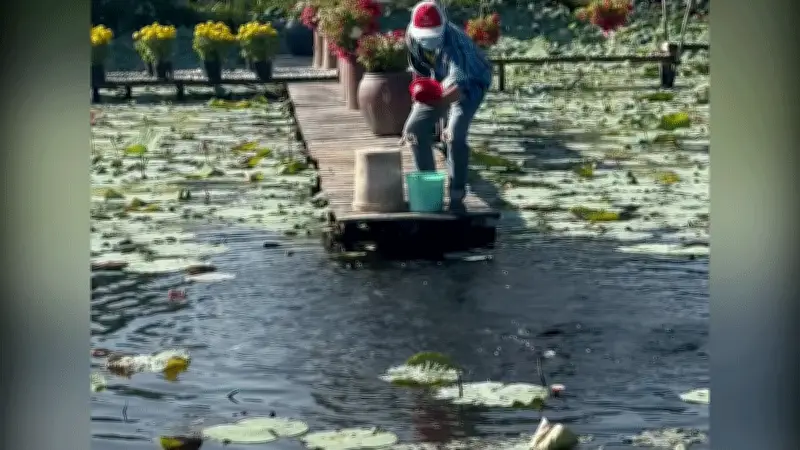 Đoạn video ghi lại cảnh tượng này cho thấy, người đàn ông vừa rải thức ăn vừa gõ nhịp vào thùng nhựa như một hiệu lệnh quen thuộc. Chỉ trong vài giây ngắn ngủi, mặt nước bỗng trở nên sôi động khi hàng chục con cá lóc liên tục bật nhảy theo phản xạ tự nhiên. Những cú nhảy dứt khoát và đồng loạt tạo nên âm thanh lách tách vui tai, hòa quyện với không gian rực rỡ sắc hoa của khu vườn.