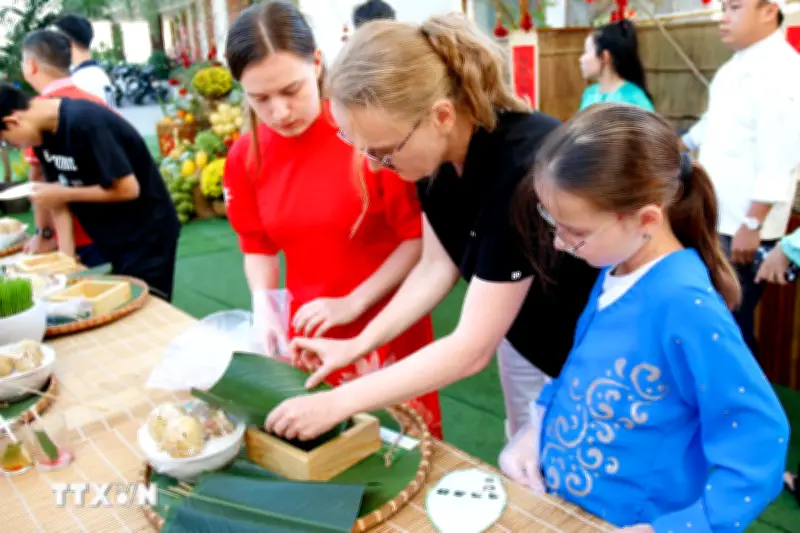 Các hoạt động trải nghiệm được thiết kế công phu, bao gồm việc hướng dẫn du khách nước ngoài tham gia vào quy trình gói bánh chưng, bánh tét – những món ăn không thể thiếu trong mâm cỗ Tết cổ truyền. Bên cạnh đó, du khách còn được trực tiếp học cách viết thư pháp, trang trí nhà cửa với câu đối đỏ, hoa mai, hoa đào, và thưởng thức các tiết mục múa lân sôi động.