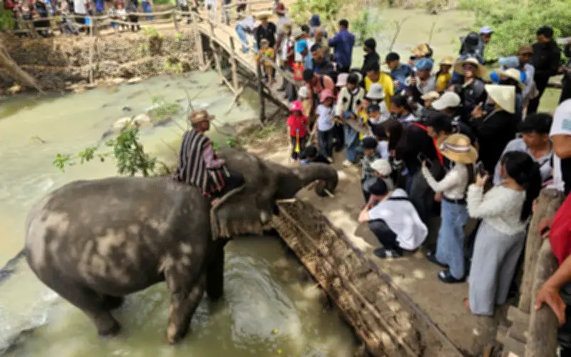 Ngay từ mùng 1 Tết, khu du lịch cầu treo Buôn Đôn đã đón một lượng lớn du khách đổ về. Tại đây, nhiều chương trình hấp dẫn được tổ chức như lì xì vé cho những người tuổi Ngọ, trải nghiệm ẩm thực đặc sản, và thưởng thức các tiết mục dân gian tại làng đảo Buôn Đôn. Du khách còn có cơ hội ngắm nhìn và cho voi ăn, mang lại những khoảnh khắc thú vị và đáng nhớ.