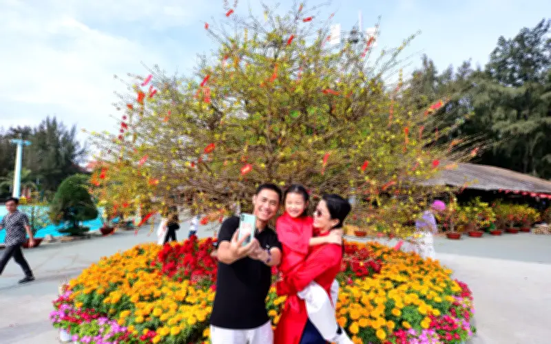 Chị Mai Lý cùng chồng và con gái nhỏ từ quận 7 đã tranh thủ đến tham dự lễ hội. Gia đình chị thích thú khi được ngắm khinh khí cầu, thưởng lãm 300 cây mai đang nở vàng rực rỡ, đào đỏ thắm và tham gia các trò chơi dân gian như làm bao lì xì, bắn súng. "Chuyến đi tạo không khí Tết sôi động, gần gũi cho cả gia đình", chị Mai Lý chia sẻ.