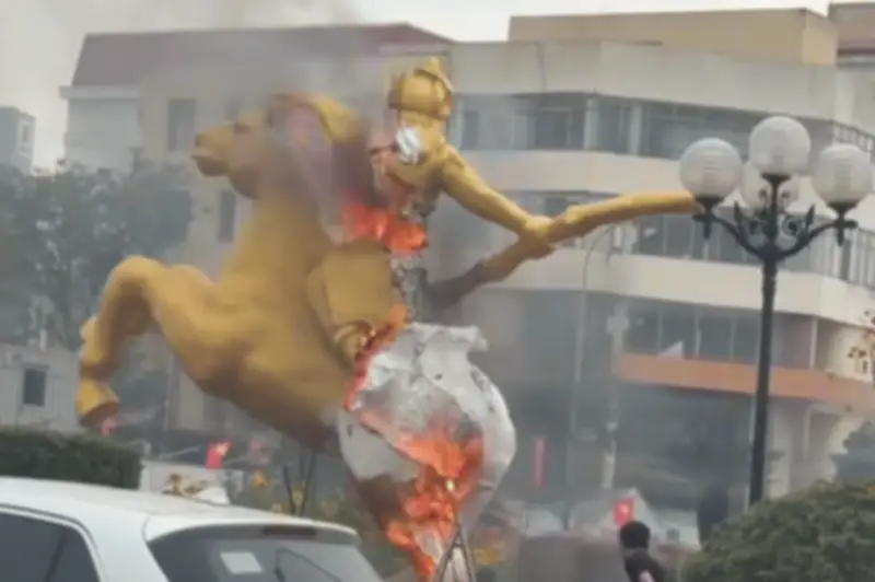 Ngọn lửa bùng phát nhanh chóng, thiêu rụi phần lớn cấu trúc gỗ của linh vật. Lực lượng cứu hỏa đã có mặt kịp thời để dập tắt đám cháy, ngăn chặn lan rộng sang các khu vực lân cận. Tuy nhiên, linh vật đã bị hư hỏng nặng, gây thiệt hại về tài sản ước tính hàng chục triệu đồng.