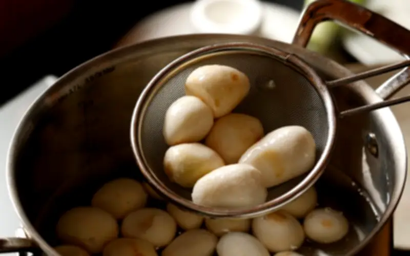 - Chuẩn bị 1-2 nhánh sườn non (khoảng 2-3 gram), ngâm muối rửa sạch, chần qua nước sôi rồi hầm trong 30 phút cho mềm. Có thể thêm 2-3 củ hành tím đập dập để tăng hương vị.