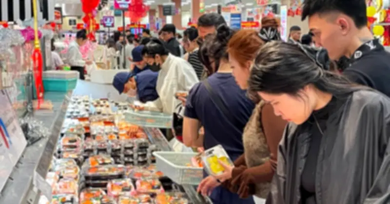 Khu vực bán đồ ăn chế biến sẵn cũng nhộn nhịp không kém, với khách hàng liên tục ghé qua để mua các món ăn nhanh, tiện lợi. Đồng thời, siêu thị trong trung tâm thương mại thu hút đông đảo người đến mua sắm, đặc biệt là các mặt hàng thực phẩm tươi sống. Nhiều người tranh thủ cơ hội này để bổ sung thêm rau xanh, hoa quả sau nhiều ngày Tết với các món ăn giàu đạm và truyền thống.