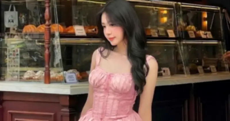 Sắc hồng ngọt ngào của chiếc đầm hai dây xòe kết hợp với thiết kế buộc dây ngực tinh tế giúp định hình vóc dáng. Phần thân áo dáng corset tôn vòng một hoàn hảo đồng thời khéo léo khoe vòng eo nhỏ, chỉ cần thêm trang sức mảnh đơn giản là có thể tự tin xuống phố. Ảnh: @_VU.NGUYETT_