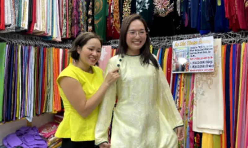 Những ngày cận Tết Bính Ngọ, dịch vụ may áo dài siêu tốc lấy ngay trong ba tiếng tại chợ An Đông, quận 5, TP HCM đang trở thành điểm đến thu hút đông đảo khách hàng. Nhiều người, đặc biệt là giới trẻ, tìm đến đây để may gấp áo dài phục vụ nhu cầu chụp ảnh, dự tiệc tất niên với thời gian hạn hẹp.
