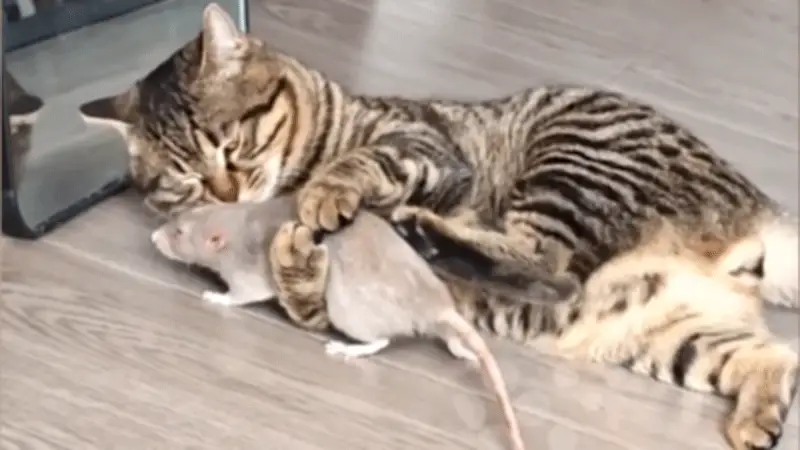Đoạn video lan truyền trên mạng xã hội cho thấy chú mèo và chú chuột thoải mái nằm lăn ra sàn nhà, vô tư đùa giỡn với nhau. Không hề có dấu hiệu của sự rượt đuổi hay tấn công, cả hai dường như hoàn toàn tin tưởng và hòa hợp trong không gian chung.