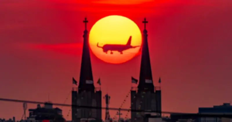 Một bức ảnh đặc sắc ghi lại cảnh mặt trời trứng muối như đang 'nuốt chửng' chiếc máy bay ngay chính giữa hai tháp nhà thờ đã nhanh chóng thu hút sự chú ý rộng rãi trên các nền tảng mạng xã hội. Tác phẩm này là thành quả của quá trình lao động nghệ thuật đầy tâm huyết và kiên trì từ nhiếp ảnh gia Trần Phương.