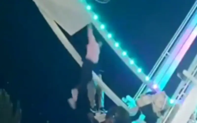 Hình ảnh ghi lại từ hiện trường cho thấy cabin của vòng quay khổng lồ bị nghiêng hoàn toàn, đẩy những người bên trong vào tình thế cực kỳ nguy hiểm. Trong lúc sự cố xảy ra, người phụ nữ đã mất thăng bằng và ngã từ độ cao khá lớn, khiến mọi người xung quanh hoảng loạn.