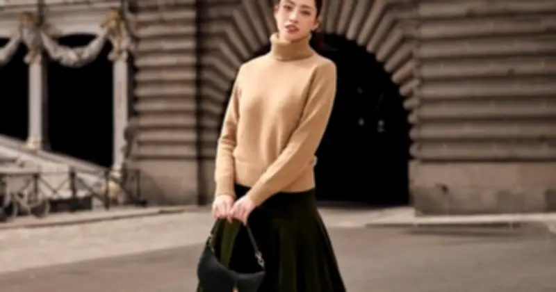 Váy xòe đã trở thành một trong những dáng váy thống trị năm 2026 nhờ vào sự mềm mại và khả năng ứng dụng linh hoạt. Bản phối giữa áo len cổ lọ màu beige và chân váy xòe màu xanh rêu mang lại cảm giác ấm áp và duyên dáng, với chiều dài qua gối tạo nên phong thái sang trọng thầm lặng. Sắc rêu trầm kết hợp cùng beige trung tính tạo nên một bảng màu tinh tế, phù hợp với mọi hoàn cảnh công sở.