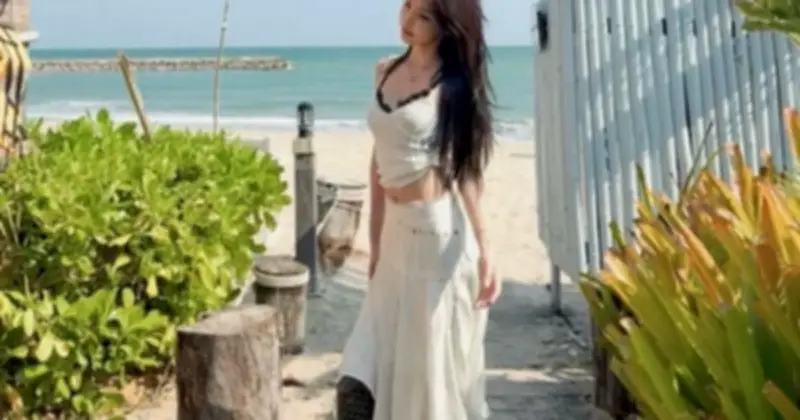 Chân váy trắng dáng midi xòe nhẹ mang đến vẻ ngoài dịu dàng và bay bổng, đặc biệt phù hợp với những ngày nắng bên biển. Thiết kế cạp vừa vặn giúp tôn lên vòng eo thon gọn, trong khi chất liệu vải mềm mại khiến tà váy chuyển động nhẹ nhàng theo từng bước chân. Khi kết hợp với áo hai dây dáng ngắn, tổng thể trang phục trở nên thanh thoát và hiện đại nhờ khoảng hở tinh tế ở phần eo. Điểm nhấn với túi xách đan màu đen giúp bộ đồ hài hòa hơn về màu sắc và chất liệu, tạo nên sự cân bằng hoàn hảo.