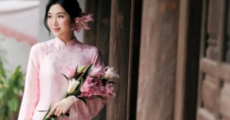 Trong không khí ngày đầu năm, áo dài truyền thống màu hồng nhạt với họa tiết chìm mang đậm hơi thở văn hóa dân tộc. Chất liệu gấm bắt sáng nhẹ tạo hiệu ứng sang trọng và quý phái. Điểm nhấn tinh tế nằm ở đóa hoa ly sắc hồng được cài lệch một bên trên mái tóc. Hoa cài tóc trong trường hợp này không chỉ làm mềm đường nét gương mặt mà còn tạo sự kết nối khéo léo giữa trang phục và phụ kiện cầm tay, như một bức tranh xuân sống động.