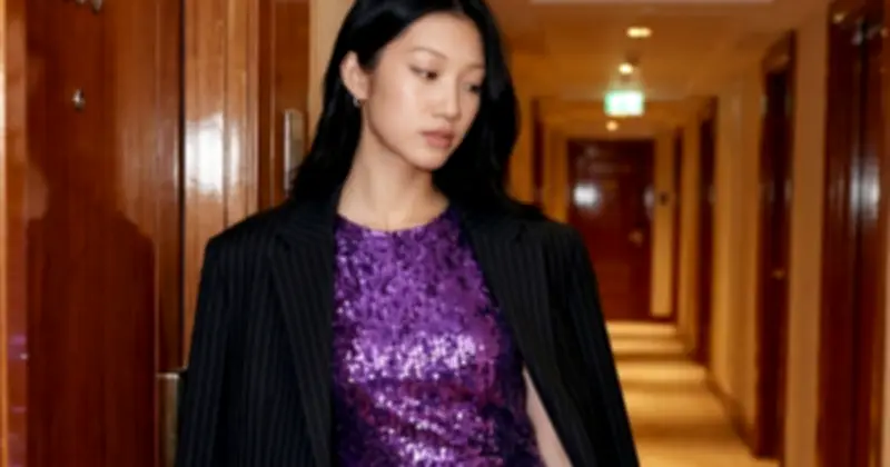 Sự kết hợp thú vị giữa màu tím và đen, cùng họa tiết kẻ sọc dọc mang tinh thần của các bộ trang phục menswear, có thể tạo nên bản phối độc đáo khi đi cùng thiết kế đầm sequin tím lãng mạn và mẫu túi loang màu ấn tượng. Áo blazer còn tạo nên điểm nhấn thị giác cho bản phối dự tiệc sang chảnh, kiêu kỳ, đặc biệt phù hợp cho các sự kiện trọng đại dịp đầu năm.