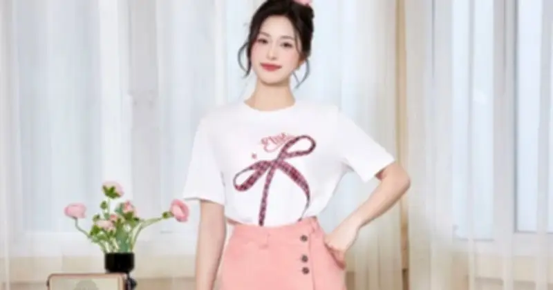 Bản phối áo thun trắng với chân váy kaki mang đến vẻ ngoài vừa thanh lịch vừa trẻ trung. Để tránh sự đơn điệu, nhiều thiết kế áo thun trắng được điểm xuyết thêm các họa tiết sinh động, chẳng hạn như hình nơ bản lớn, tạo điểm nhấn thu hút. Khi kết hợp với chân váy kaki màu pastel như hồng phấn, phom dáng chữ A cùng thiết kế lệch tà, tổng thể trang phục giúp tôn lên đôi chân dài thon gọn một cách khéo léo.