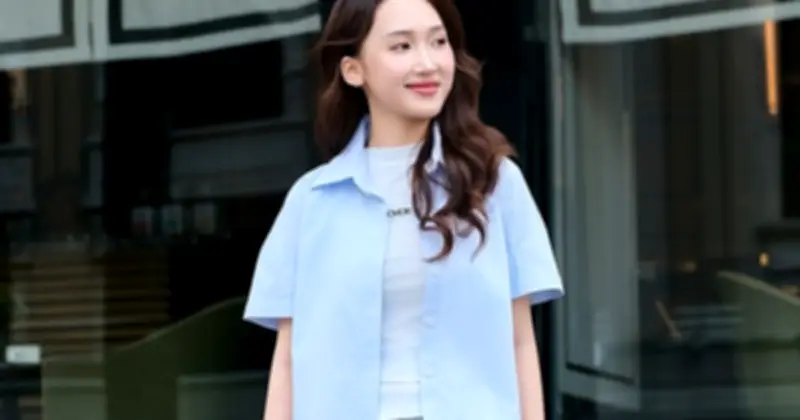 Một bản phối khác là áo sơ mi xanh kẻ sọc dáng ngắn phối cùng chân váy màu kem nhã nhặn. Chân váy dáng dài chất liệu kaki dày dặn cùng độ xòe vừa phải. Kết hợp cùng đôi giày thể thao trắng đế cao với chất liệu da chống nước, các cô gái có thể tự tin trong môi trường văn phòng hoặc những buổi gặp gỡ thân mật.