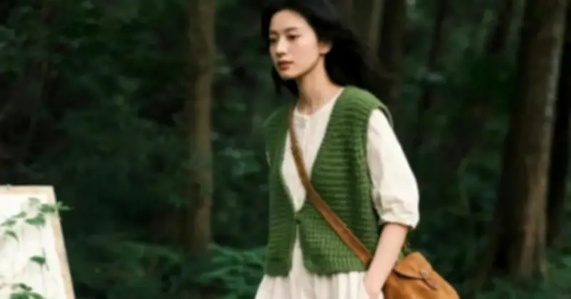 Để tăng thêm sức hút, chiếc túi da nâu đeo chéo được kết hợp, mang đầy chất thơ và phong cách. Ngoài ra, áo gile len màu xanh rêu khoác ngoài làm nổi bật nền váy sáng, tạo nên sự tương phản hài hòa và ấn tượng.
