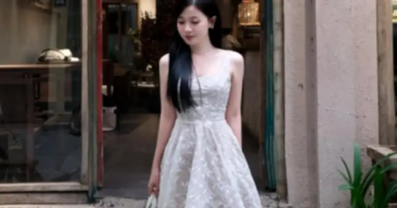 Váy cổ vuông còn xuất hiện qua thiết kế dáng ngắn với chi tiết nơ nhỏ đặt ở trung tâm thân áo, tạo nên vẻ đẹp quyến rũ và nữ tính. Phần thân trên ôm gọn, trong khi chân váy xòe rộng, giúp cân bằng tổng thể. Chi tiết cổ vuông trong thiết kế này đóng vai trò định hình toàn bộ bố cục phần thân trên, và khi phối cùng dây chuyền mảnh, nó tạo điểm nhấn thu hút người đối diện, làm nổi bật vẻ duyên dáng của người mặc.