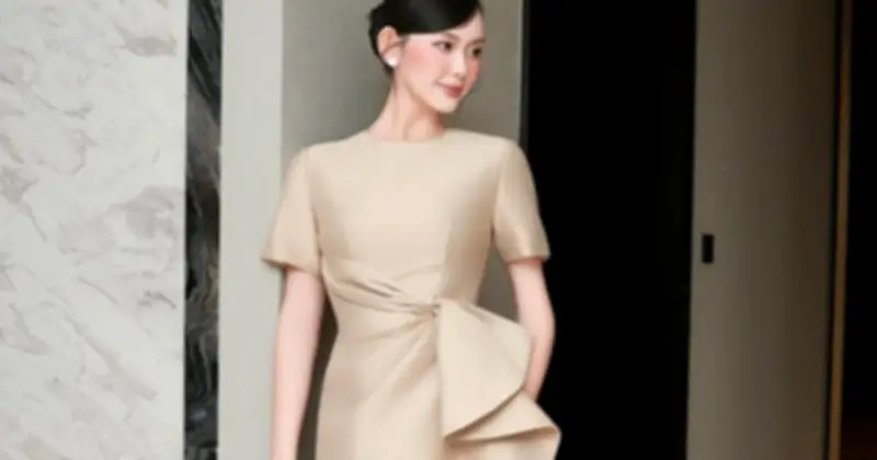 Một ví dụ điển hình là đầm gấm dệt jacquard cổ chữ V với nẹp nhỏ tôn vòng eo "con kiến", kết hợp cùng túi xách màu trắng, hoa tai ngọc trai và găng tay nhung đen để tạo nên vẻ ngoài quý phái. Thiết kế này dày dặn, đứng phom và có tông màu cùng họa tiết nổi bật, phù hợp cho nhiều dịp khác nhau.