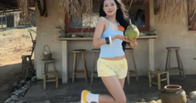 Áo sơ mi kẻ xanh khoác ngoài bikini hồng mang đến vẻ phóng khoáng, khi phối cùng quần shorts trắng tươi mát đậm chất hè. Chiếc túi tote sọc vàng trở thành điểm nhấn nổi bật, thu hút ánh nhìn và làm bừng sáng cả tổng thể.