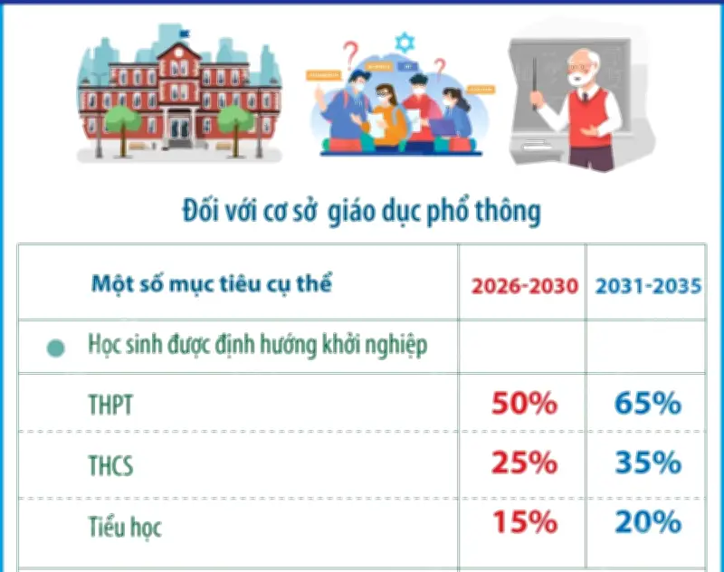Một mục tiêu quan trọng trong lĩnh vực giáo dục đã được đặt ra, hướng đến việc trang bị kỹ năng và tư duy khởi nghiệp cho thế hệ trẻ. Theo đó, đến năm 2030, phấn đấu có 50% học sinh trung học phổ thông (THPT) trên cả nước được định hướng về khởi nghiệp.