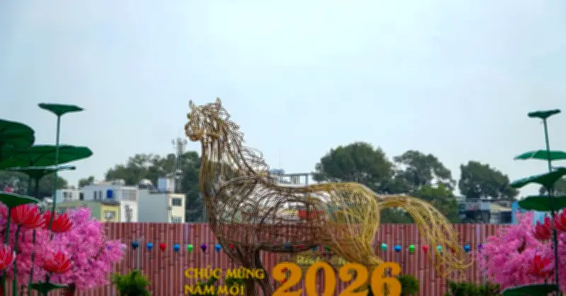 Điểm nhấn nổi bật của công viên là linh vật ngựa khổng lồ, được tạo hình bằng kết cấu thép uốn cong, phủ vật liệu trang trí và tích hợp hệ thống chiếu sáng hiện đại. Công trình này nổi bật cả ban ngày lẫn ban đêm, mang thông điệp về sức sống, sự chuyển động và tinh thần khởi đầu tích cực cho năm mới Bính Ngọ. Bên cạnh biểu tượng trung tâm, công viên còn được bố trí nhiều tiểu cảnh hoa xuân, không gian check-in, khu vực nghỉ chân và các lối đi bộ liên hoàn, tạo nên một tổng thể hài hòa giữa cảnh quan, nghệ thuật và trải nghiệm cộng đồng.