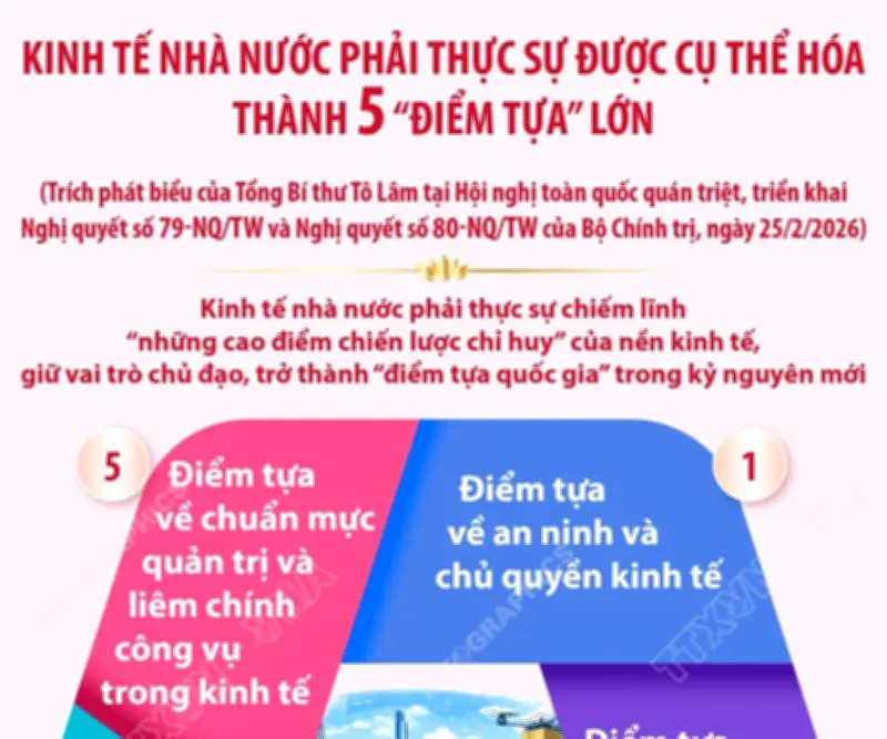 Để thực hiện mục tiêu này, Tổng Bí thư Tô Lâm yêu cầu trong giai đoạn mới, kinh tế nhà nước phải được cụ thể hóa thành 5 "điểm tựa" lớn, bao gồm: