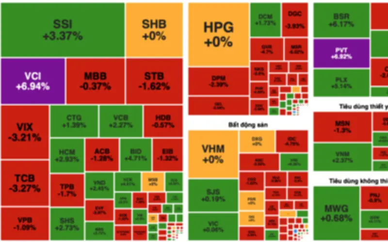 Thanh khoản toàn thị trường tăng vọt, đạt hơn 48.000 tỷ đồng, với dòng tiền tập trung mạnh ở nhóm vốn hóa lớn và cổ phiếu chứng khoán. SSI dẫn đầu thị trường về giá trị giao dịch với hơn 3.000 tỷ đồng (gần 93 triệu cổ phiếu), tiếp theo là FPT với hơn 2.000 tỷ đồng (gần 24 triệu đơn vị). Các mã khác như HPG (khoảng 1.867 tỷ đồng), SHB (hơn 1.335 tỷ đồng), VCI (khoảng 1.325 tỷ đồng) và POW (hơn 1.164 tỷ đồng) cũng ghi nhận giá trị khớp lệnh cao. MWG, VHM, MBB và VIX cũng có giá trị giao dịch trên 1.000 tỷ đồng.