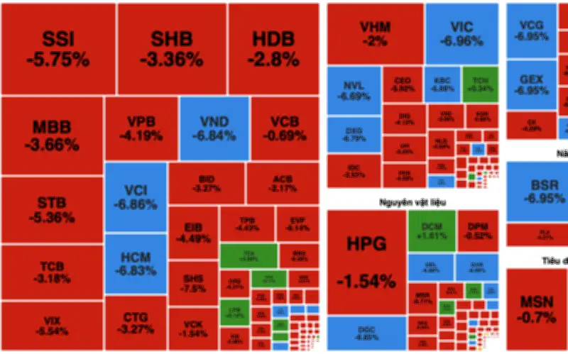 Kết phiên, VN-Index giảm 56,6 điểm (-3,4%) xuống 1.591,2 điểm. Độ rộng thị trường nghiêng hẳn về phía tiêu cực với 648 mã giảm so với 119 mã tăng, cho thấy lực bán lan tỏa trên hầu hết các nhóm ngành. Nhiều cổ phiếu đóng cửa ở mức giá sàn, đặc biệt tập trung tại nhóm chứng khoán và bất động sản.