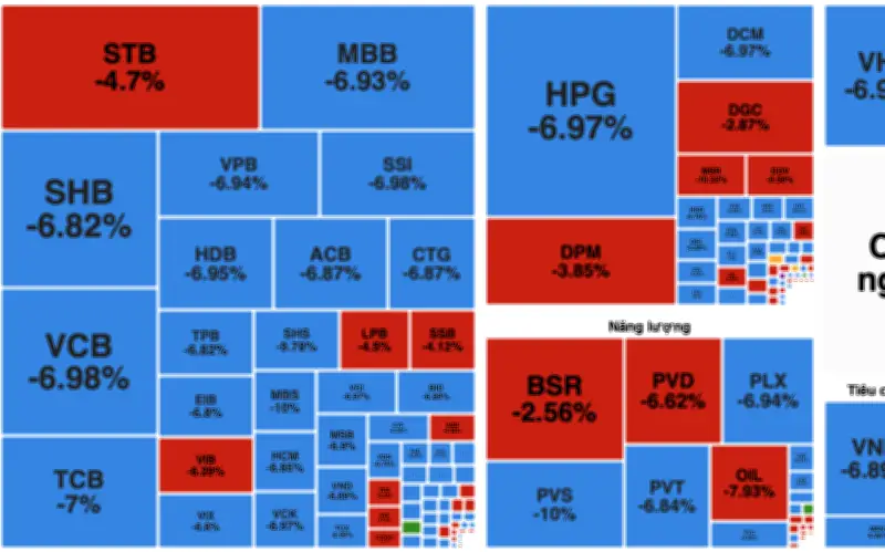 Áp lực bán diễn ra trên hầu hết các nhóm ngành, không có ngoại lệ đáng kể. Tại nhóm ngân hàng, nhiều cổ phiếu giảm kịch biên độ như MBB, SHB, VCB, TCB, VPB, HDB, TPB, EIB, ACB, CTG và BID. Một số mã khác như STB, VIB và LPB cũng giảm mạnh.