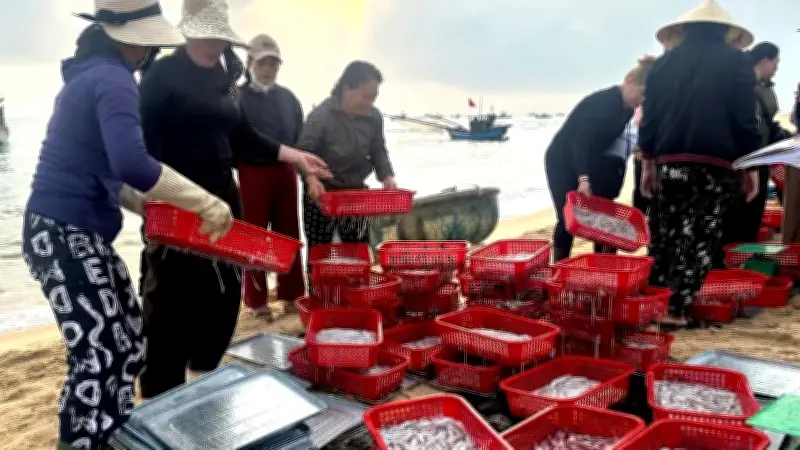 Ngay bên mép sóng, một khu chợ cá tự phát hình thành với cảnh mua bán hải sản diễn ra tất bật. Ngư dân Lê Văn Suối, cư dân thôn Nhân Hải, cùng người cháu của mình vừa khiêng từng giỏ cá nặng vào bờ, vừa chia sẻ về công việc của mình. Ông Suối cho biết, nhiều ngư dân trong vùng, bao gồm cả ông, đã bắt đầu ra khơi từ ngày mồng 3 Tết. Họ thường xuất bến vào khoảng 3 giờ sáng, di chuyển ra xa bờ chừng 5-7 hải lý để buông neo và thả lưới đánh cá. Đến 6 giờ, khi mặt trời vừa ló dạng, họ quay về kịp thời để tham gia phiên chợ cá sớm ngay trên triền cát.