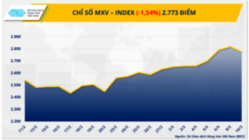 Đóng cửa phiên giao dịch, chỉ số MXV-Index đánh mất hơn 1,5% về mức 2.773 điểm, phản ánh tâm lý thận trọng trên thị trường tài chính trong nước trước những biến động phức tạp của giá cả hàng hóa toàn cầu.