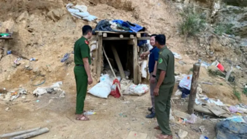 Khi tiến hành kiểm tra tại hiện trường, lực lượng chức năng phát hiện khu vực khai thác có diện tích khoảng 1.000 m2 bị đào xới nham nhở, địa hình đồi đất bị biến dạng nghiêm trọng. Tại đây, có 2 hầm được đào sẵn trước đó, và ở cửa hầm, tổ công tác thu giữ 14 bao quặng với tổng khối lượng lên đến 262,5 kg.