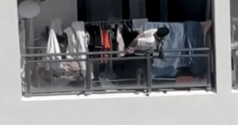 Trong khung hình, người đàn ông mặc áo phông và quần cộc đứng trên ban công tầng cao. Điều khiến ai xem cũng phải rùng mình là đôi tay của anh ta bị trói gọn ra phía sau với vẻ mặt vô cùng hoảng loạn và tuyệt vọng. Anh ta liên tục hét lớn xuống phía dưới, hy vọng có ai đó trong khu vực có thể nhìn thấy và ra tay giải cứu.