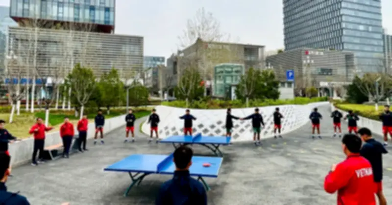 Thay vì tập trong phòng gym, thầy trò U.23 Việt Nam đã tìm đến một công viên gần khách sạn, nơi có khoảng trống rộng rãi và được trang bị 2 bàn bóng bàn ngoài trời - minh chứng cho sự phổ biến của môn thể thao này tại Trung Quốc. Trong gần một giờ đồng hồ, HLV Đinh Hồng Vinh đã hướng dẫn toàn đội thực hiện các bài vận động nhẹ tại chỗ.