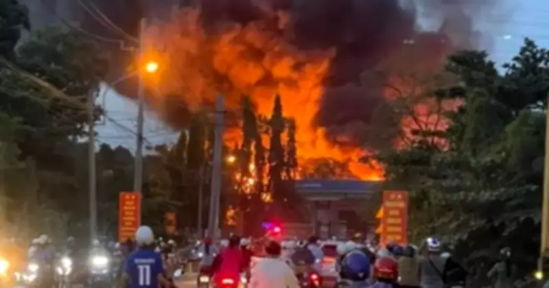 Đám cháy tạo ra một cột khói đen dày đặc, bao trùm cả khu vực xung quanh và khiến tầm nhìn bị hạn chế nghiêm trọng. Điều đáng lo ngại là vụ hỏa hoạn này xảy ra ngay sát một cây xăng, làm dấy lên mối lo ngại về nguy cơ cháy nổ lan rộng.