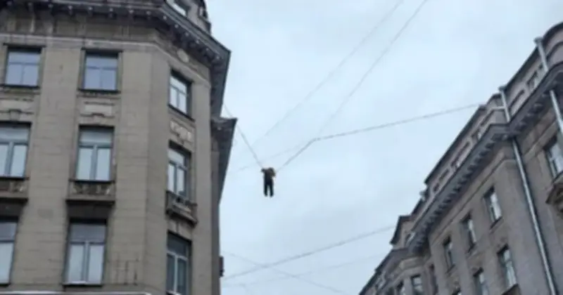 Một đoạn clip gây sốc từ St Petersburg, Nga, đã ghi lại cảnh tượng nguy hiểm khi một người đàn ông đang đu đưa lơ lửng trên đường dây điện phía trên con phố đông đúc. Những sợi dây điện mắc kẹt dưới nách của anh ta, trong khi người này tuyệt vọng cố gắng giữ thăng bằng để tránh rơi xuống mặt đất cứng bên dưới.