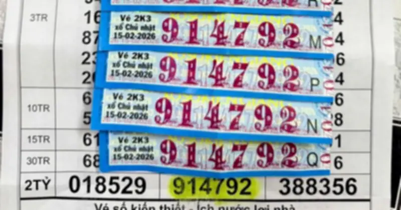 Đại lý vé số Đại Phát ở phường Phú Lâm, TP.HCM cho biết đã đổi thưởng thành công 5 tờ vé số trúng độc đắc cho một khách hàng. Các tờ vé này có dãy số 914792, thuộc đài Kiên Giang, mở thưởng trong kỳ xổ số miền Nam ngày 15 tháng 2. Tổng giá trị giải thưởng lên đến 10 tỉ đồng, chưa trừ thuế.