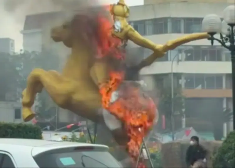Vào khoảng 16 giờ ngày 10 tháng 2, trong lúc nhóm công nhân tập trung thi công các phần yên, đuôi và chân của linh vật ngựa, một ngọn lửa bất ngờ bùng lên. Ngay lập tức, công nhân và người dân xung quanh đã nỗ lực dập lửa bằng áo và các phương tiện thô sơ. Tuy nhiên, do linh vật được làm từ chất liệu xốp và nhựa composite, ngọn lửa lan nhanh chóng và không thể kiểm soát, khiến toàn bộ cấu trúc đổ sập. May mắn, vụ việc không gây ra bất kỳ thiệt hại nào về con người.
