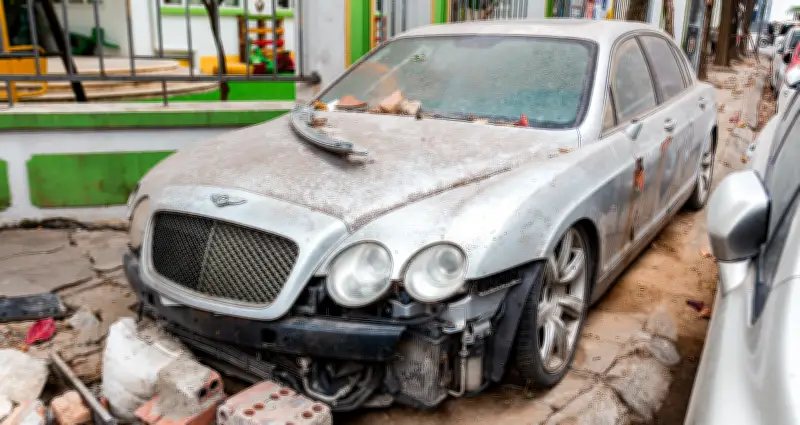 Chiếc Bentley đã xuống cấp trầm trọng sau hơn một thập kỷ bị bỏ mặc. Nước sơn màu bạc bong tróc, trầy xước khắp nơi, để lộ phần thân vỏ hoen rỉ. Bên ngoài phủ đầy bụi bẩn, khó làm sạch do tiếp xúc lâu ngày với thời tiết.