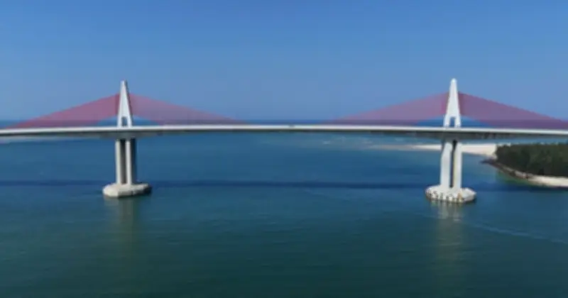 Một trong những điểm nổi bật của cây cầu là hệ thống dây văng màu đỏ, được neo trên hai trụ chính hình chữ A vươn cao giữa cửa biển. Với chiều dài và độ cao ấn tượng, cầu nằm vắt ngang vùng cửa biển rộng và thoáng, khiến công trình này dễ dàng được nhìn thấy từ xa hàng cây số.