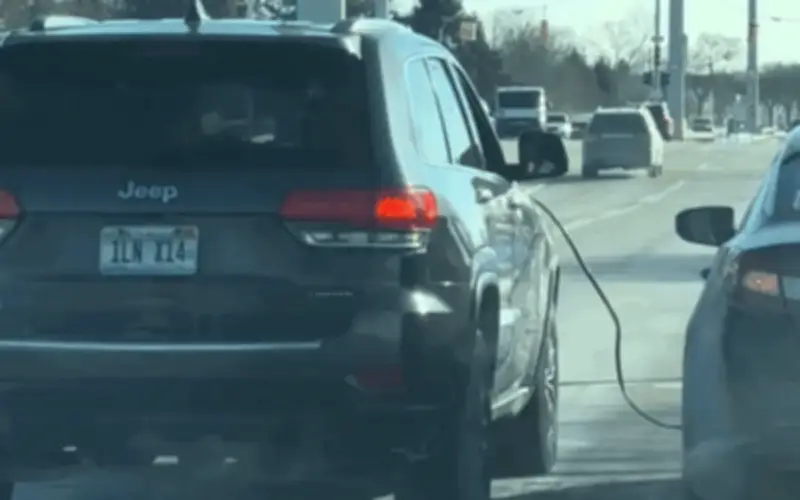 Clip được chia sẻ rộng rãi cho thấy một chiếc SUV Jeep và một sedan Kia chạy song song giữa dòng xe cộ đông đúc. Giữa hai xe là một sợi dây cáp được kết nối từ đầu xe này sang đầu xe kia, nhiều khả năng dùng để truyền điện từ ắc quy hoặc máy phát của một xe sang xe còn lại. Theo hình ảnh ghi lại, một trong hai chiếc xe dường như gặp sự cố khiến hệ thống điện không hoạt động bình thường, và trong trường hợp máy phát bị hỏng, ắc quy sẽ không được sạc, dẫn đến nguy cơ xe chết máy sau một thời gian ngắn.