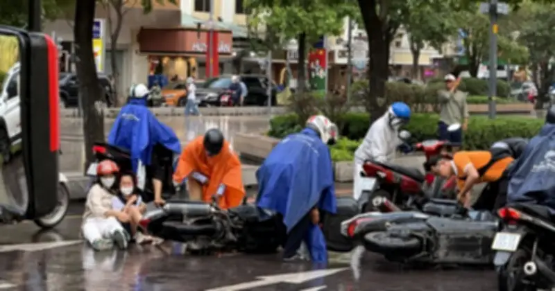 Khoảng 16 giờ 30 ngày 16 tháng 3, chỉ sau khoảng 5 phút cơn mưa bắt đầu, một vụ va chạm nhẹ giữa các xe máy đã xảy ra trên đường Nguyễn Huệ, đoạn giao với đường Lê Lợi (phường Sài Gòn), đối diện Thương xá Tax cũ. Do mặt đường trơn ướt, nhiều xe máy đã trượt ngã, nằm sõng soài trên mặt đường, gây cản trở giao thông và tiềm ẩn nguy cơ tai nạn.