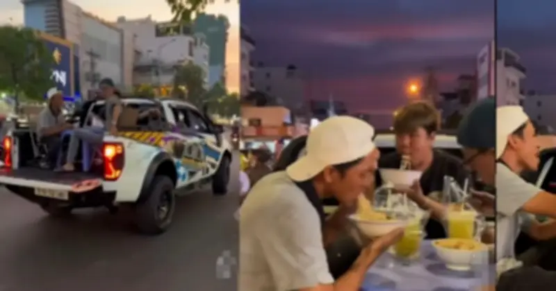Theo hình ảnh từ clip, chiếc xe bán tải chở theo ba người ngồi phía sau thùng xe. Đáng chú ý, nhóm thanh niên này không ngồi trực tiếp xuống sàn mà đã kê sẵn các loại ghế sắt và một chiếc bàn nhựa nhỏ ở giữa thùng xe, tạo không gian như một bữa tiệc di động. Khi xe di chuyển đến khu vực trước địa chỉ 178A Hậu Giang thuộc phường 6, quận 6 cũ, họ còn nhảy xuống xe, tay cầm sẵn tô và đũa để mua hủ tiếu từ một xe đẩy ven đường.