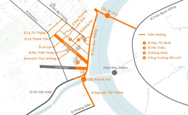 Ngoài ra, một loạt tuyến đường khác cũng nằm trong diện cấm, như Hàm Nghi, Hải Triều, Nguyễn Thiệp, Mạc Thị Bưởi, Huỳnh Thúc Kháng, Tôn Thất Thiệp, Nguyễn Công Trứ, Hai Bà Trưng, Hồ Tùng Mậu, và Tôn Thất Đạm. Các đường xung quanh vòng xoay Công trường Mê Linh, bao gồm Ngô Đức Kế, Hồ Huấn Nghiệp, Thi Sách, R12, Cầu Ba Son, và Khánh Hội, cũng bị cấm xe trong thời gian này.