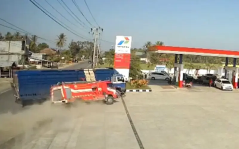 Theo đoạn clip từ camera giám sát, chiếc xe tải ba trục màu xanh lam đang rẽ phải về phía Trạm xăng Karieng ở phía bên kia đường cao tốc thì bất ngờ bị chiếc xe cứu hỏa màu đỏ lao tới đâm trúng. Chiếc xe cứu hỏa được cho là đã mất kiểm soát và lao ra khỏi đường, dẫn đến va chạm mạnh với xe tải. Hậu quả là xe cứu hỏa do lính cứu hỏa Rudi Hartono, 48 tuổi, điều khiển bị hư hại nặng, trong khi xe tải màu xanh lam bị móp ở hông và cabin.