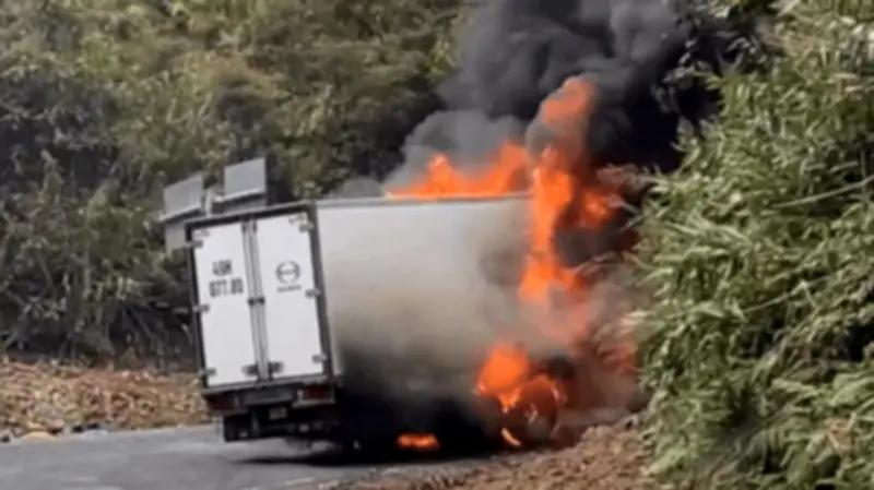 Xe tải bốc cháy dữ dội trên đèo Khánh Lê, tài xế may mắn thoát nạn kịp thời